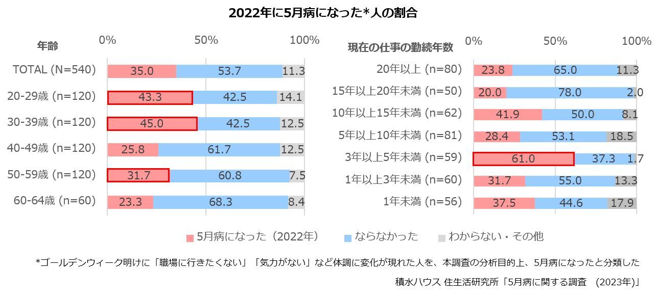 ・5月病は新入社員だけのものじゃない。30代の45.0%、入社3-5年目の61.0%が2022年に5月病を経験。