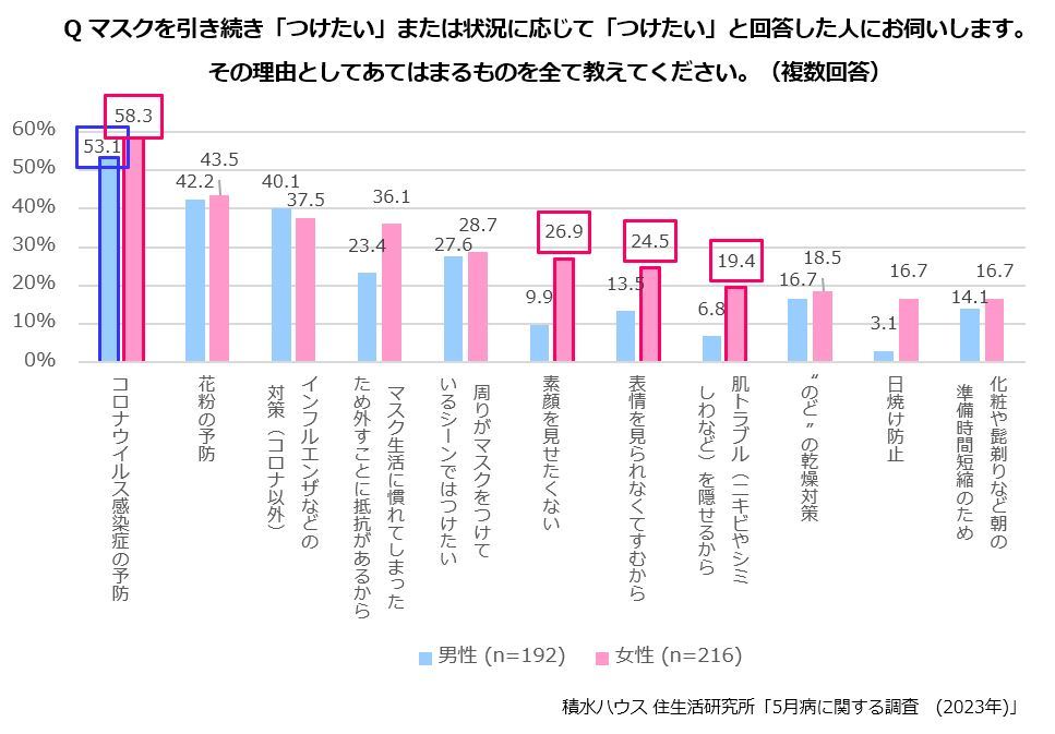屋内ではマスクをつけたいと回答した人にその理由を聞いたところ、男女ともに半数以上が「コロナウイルス感染症の予防」を挙げました。自由化の時期が3月であったこともあり「花粉症の予防」や「インフルエンザなどの対策(コロナ以外)」が続く結果となりました。感染や花粉対策以外では「マスク生活に慣れてしまったため外すことに抵抗があるから」と回答した人が最も多く、男性は23.4%、女性は36.1%でした。また、女性は「素顔を見せたくない」26.9%、「表情を見られなくてすむから」24.5%、「肌トラブル(ニキビやシミ、しわなど)を隠せるから」19.4%といった項目を挙げた人も多く、マスクは人に見られることを避けたり、顔の気になるところを隠したりするためのひとつのツールになっているのかもしれません。