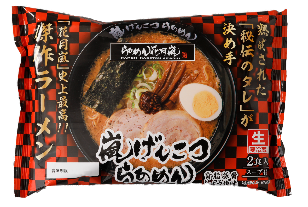 らあめん花月嵐自慢の人気商品「嵐げんこつらあめん」をご家庭でお楽しみ頂ける生袋麺。背脂醤油味。