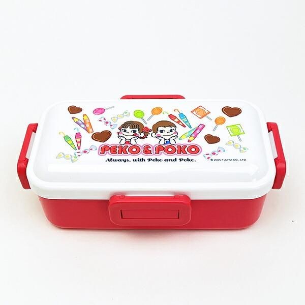 こちらは、定番の長方形型の弁当箱。ふたがドーム型なので、ごはんやおかずをふんわりと盛り付けられます。キャンディに囲まれるペコちゃんとポコちゃんのポーズがかわいい!