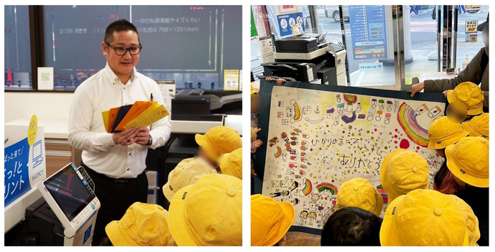 年長クラス「にじ組」の園児たち20名をキンコーズ・大宮駅東口店にお迎えし、「ひかりのマニュフェステーション」への感謝の気持ちとして、園児たちが描いた絵や手紙、そしてひまわりの種を店長が受け取りました。