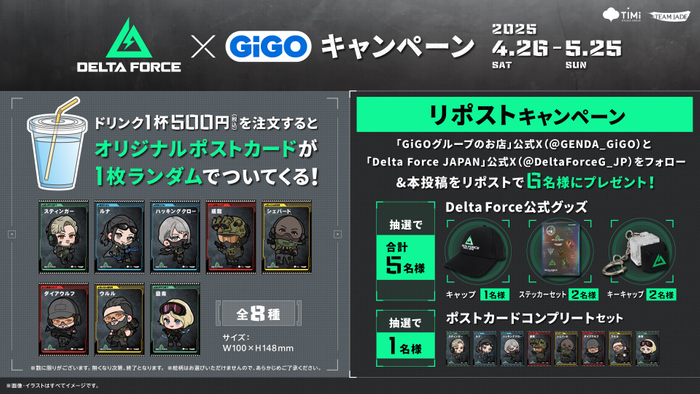 キャンペーンの開催を記念してXにてフォロー&リポストキャンペーンを実施いたします。『GiGOグループのお店 公式アカウント( https://x.com/GENDA_GiGO )』と『Delta Force Game Japanアカウント( https://x.com/DeltaForceG_JP )』をフォローの上で、該当の投稿をリポストされたお客さまの中から抽選で合計6名の方にDelta Force公式グッズなどを進呈いたします。