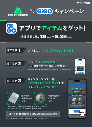 GiGOアプリをダウンロードして、キャンペーンに参加すると「Delta Forceゲーム内アイテム配布コード」を進呈いたします。