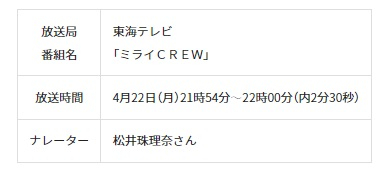 【名城大学】4/22東海テレビ「ミライCREW」で理工学研究科の江﨑響さんが紹介されます! 学校法人 名城大学 2024-04-22 19:00 本日から放送が開始される東海テレビのミニ番組「ミライCREW」で、本学理工学研究科の江﨑響さんが紹介されます。 この番組は豊かな未来の創造のために日々挑戦を続けている学生たちにスポットを当て、その夢と夢に向かって突き進む原動力に迫る内容です。記念すべき第1回目に、クロスリアリティ技術を研究する若者として、江﨑さんが紹介されます。 ぜひ、ご覧ください。 ※放送日時が変更になることがあります。 番組表 | 東海テレビ https://www.tokai-tv.com/bangumi/index.html?p=859384&s=0x0C10&e=10507&ed=20240415 名城大学開学100周年記念事業 REALIZE AWARD|名城大学100周年サイト 学校法人名城大学は2026年に開学100周年を迎えます。次の100年を見据え、「中部から世界へ、創造型実学の名城大学」を将来ビジョンに、教育、研究、社会貢献にさらに邁進してまいります。 https://www.meijo-u.ac.jp/100th/award/ 仮想空間の魅力を多くの人に伝えたい!|FEATURE PEOPLE|MEIJO MAG|名城大学 名城大学生のいろんなナンバーワンにインタビュー!様々な分野で頑張っている!?名城大学生にいろんなことを聞きました。 https://www.meijo-u.ac.jp/mag/feature-people/detail_27896.html Challengers' Voice | 名城大学チャレンジ支援プログラム https://www.meijo-u.ac.jp/challengers/voice/ 開学100周年記念企画「REALIZE AWARD 2023」 人間学部3年の秋月祐人さんが最優秀賞に輝く 学生や教職員ら聴衆約130人を前に ファ... https://www.meijo-u.ac.jp/news/detail_29772.html 理工学研究科|学部・大学院|名城大学 https://www.meijo-u.ac.jp/academics/g_sci_tech/ ジャンル: エンタメ ネット・IT タグ: 名城大 江﨑響 クロスリアリティ 東海テレビ ミライCREW XR VR 画像一覧 一括ダウンロード