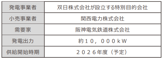 この取組みは、双日が設立する発電事業者が当社専用の太陽光発電設備を開発・運営し、関電が小売事業者として当社への電力の調達・供給を行うもので、供給開始は2026年度を予定しています。