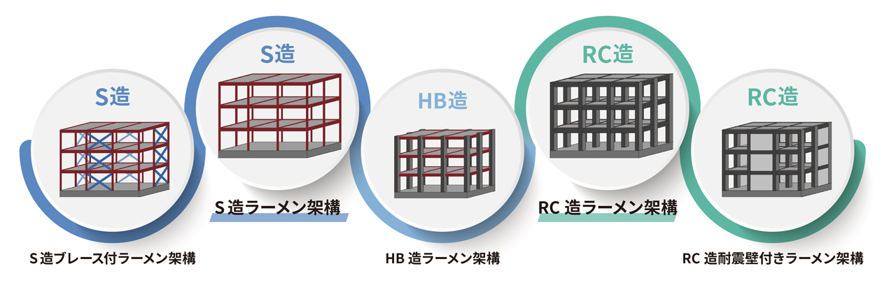 本システムは以下の構造・架構形式に対応し、幅広い建築用途への適用が可能です(図2)。(注6)