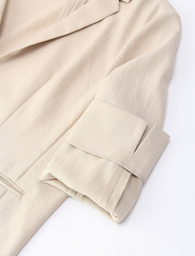 また、スッキリとした印象の8分袖やトレンド感のあるボックスシルエットに長めの着丈デザインを取り入れ、ビジネスシーンだけでなくオフの日の着回しにもおすすめです。今回のジャケットには同素材のワイドパンツを用意しており、セットアップスーツとしても着用いただけます。