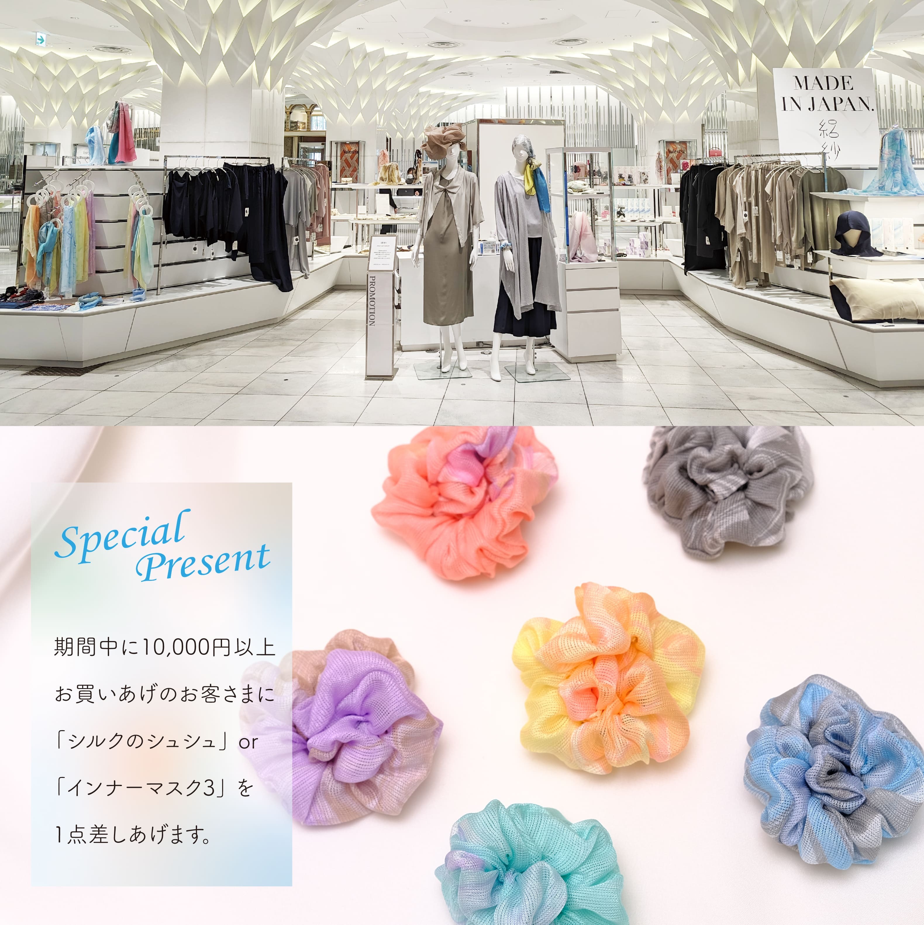 特典1:税込み1万円以上お買いあげのお客さまに、シルクのシュシュ(Sサイズ)1点もしくはインナーマスク3を1点プレゼントいたします。