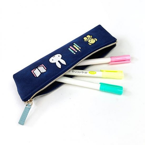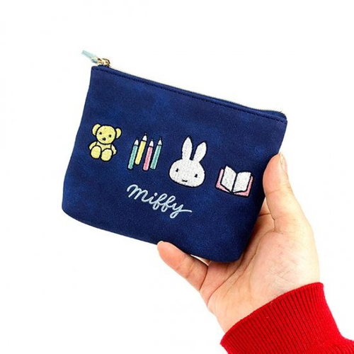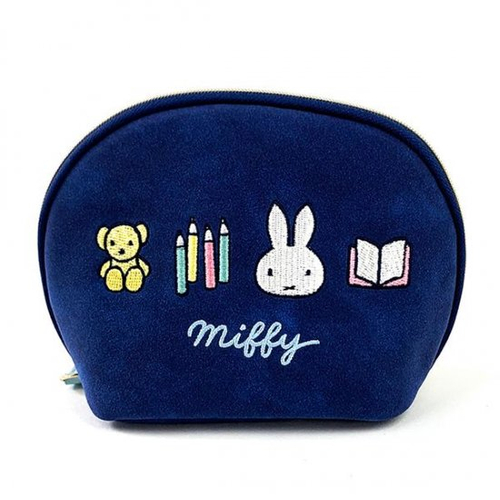 ネイビーのスウェードタッチ素材がリッチな印象の、ラウンドポーチです。ミッフィーやくま、ノートなどのワッペンが並んだデザインで、シンプルさが魅力。