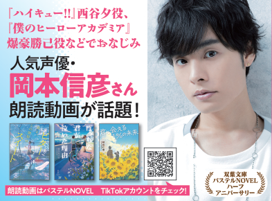 人気アニメ『ハイキュー!!』西谷夕役、『僕のヒーローアカデミア』爆豪勝己役などでおなじみの人気声優・岡本信彦さんが双葉文庫パステルNOVELの3作品のある場面を朗読。同レーベルのTikTok、Instagram、X、HPにて公開。お聴きいただくことができます。