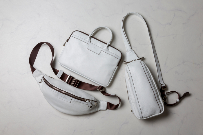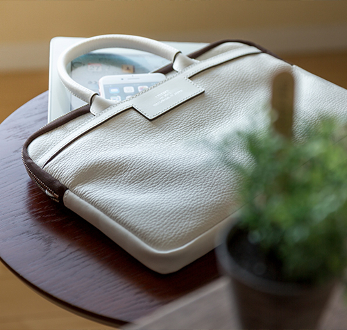 旅のお供にベストなサイズのミニブリーフ。上質なホワイトシュリンクレザーと高級感のあるメタルパーツが空の旅の楽しみを演出してくれます。強撥水加工が雨や汚れから守ってくれますので、鮮やかなホワイトカラーでも気にせずご使用いただけます。