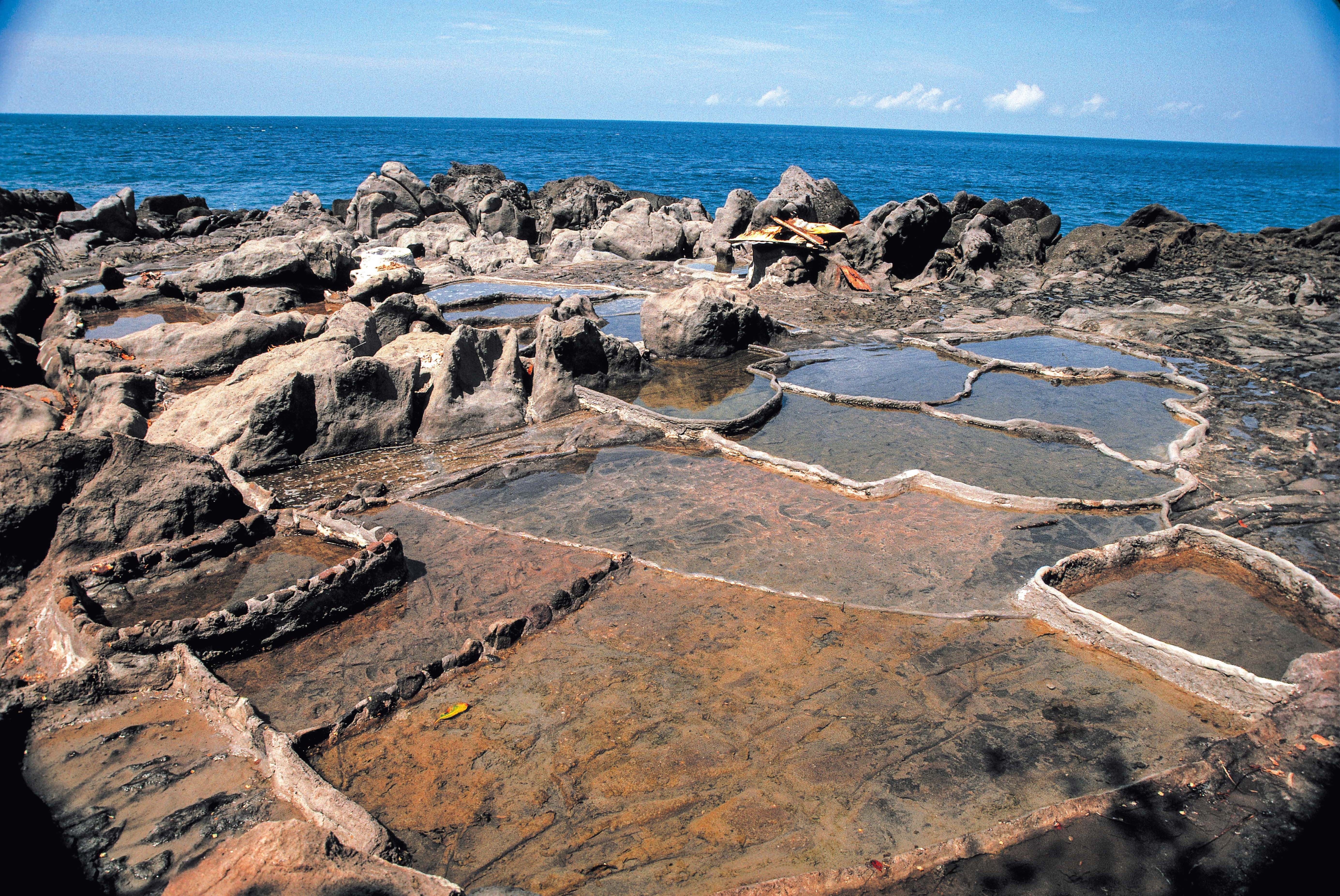 海岸の岩の上にある、灰や石灰で区切られた浅い蒸発池で海水を濃縮する。濃縮海水を持ち帰り、鉄鍋で煮つめて、塩の結晶を得る。