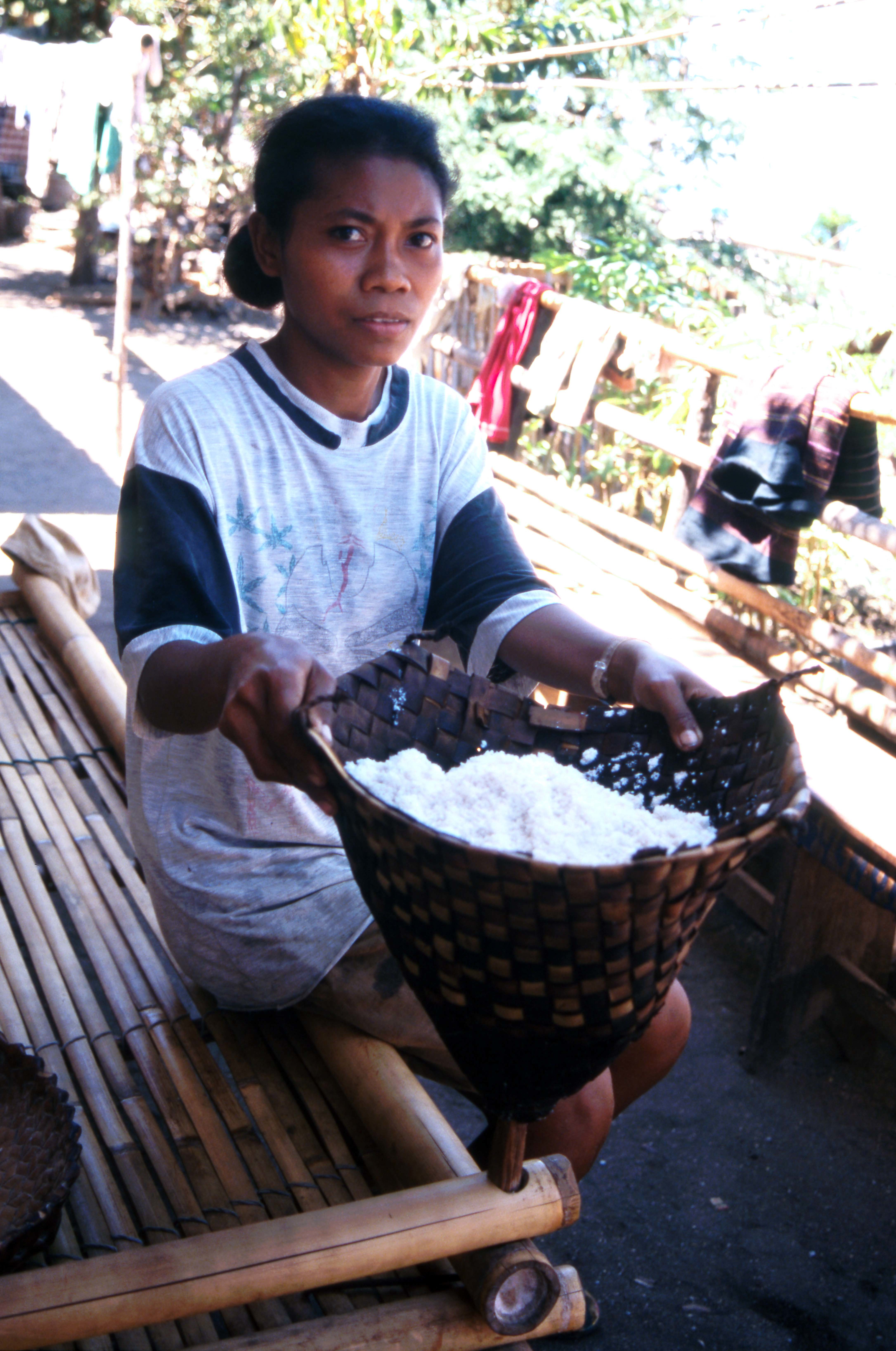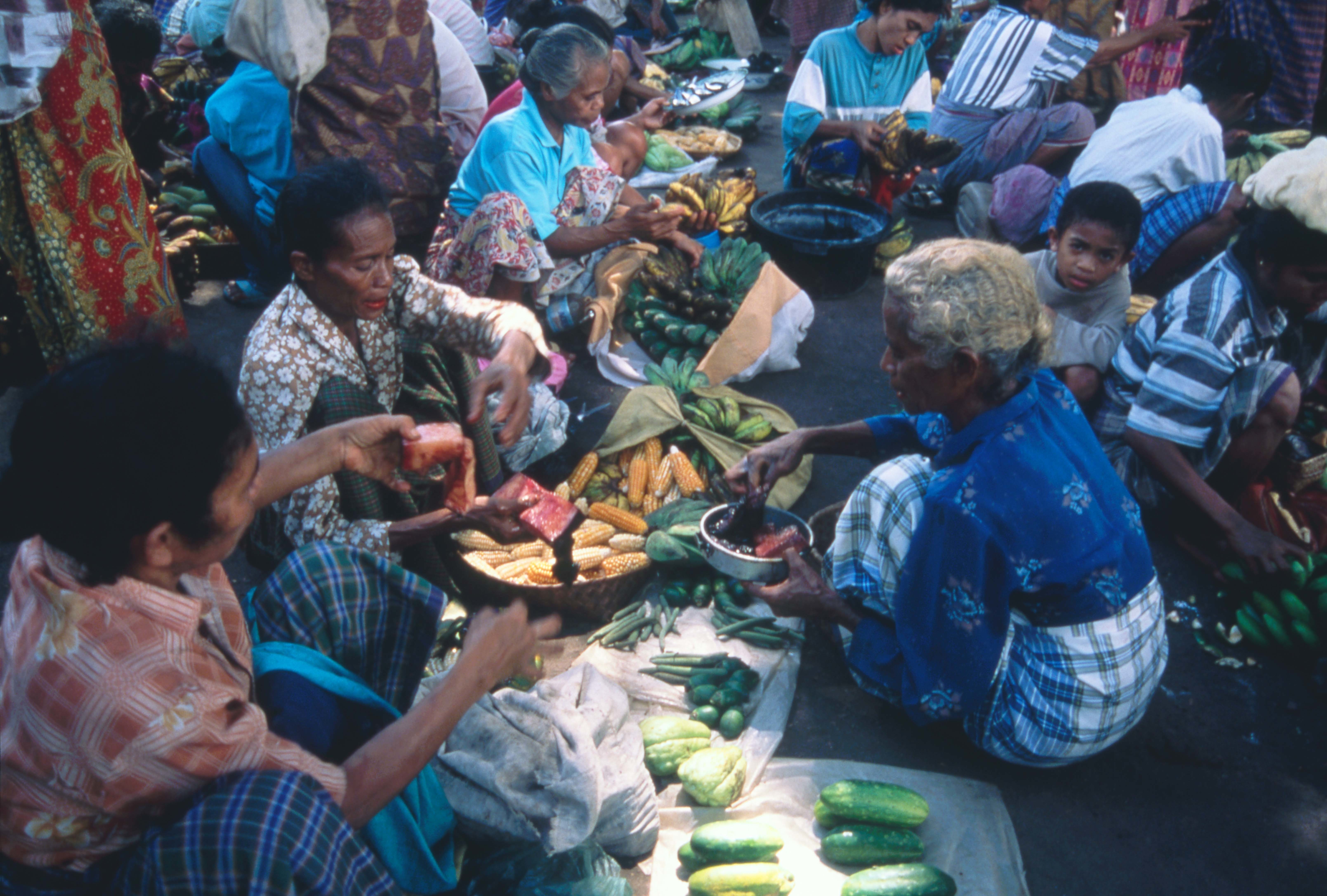 レンバタ島ラマレラ村「海の民」の女性は、クジラ肉、塩、石灰などを持って、行商や定期市に出かけ、「山の民」との物々交換で、主食となる農産物のほか、綿や染料などイカットの材料を手に入れます。