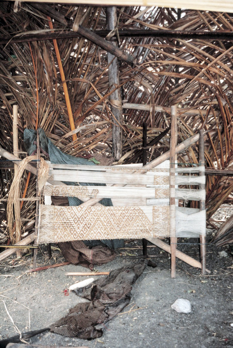 「海の民」は他島から移住してきた人々です。男性は伝統捕鯨を担い、女性は製塩や石灰づくりなどの海辺の仕事のほか「山の民」との交易を担っています。繊維素材や染料となる植物を持たない「海の民」は、「山の民」との交易で得た綿から糸を紡ぎ、藍・茜などで染め、イカットを織ります。広いインドネシアの中でも、捕鯨や漁業を営む人々がイカットを織る例は他にみられません。