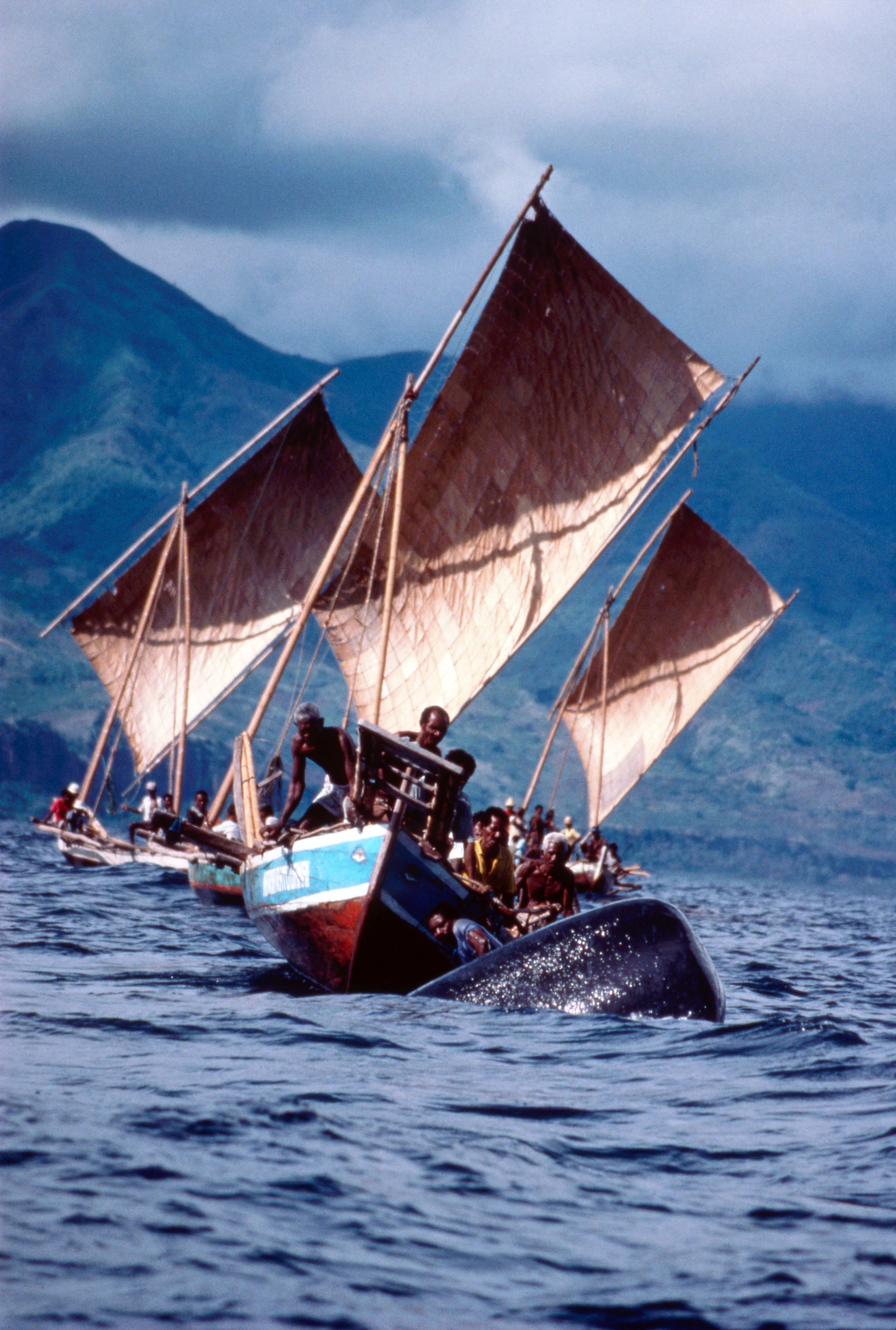 ラマレラ村では全長10メートルの木造帆船「プレダン」に10~13人ほどの「海の民」の漁師が乗り、手漕ぎで漁を行います。捕獲には手投げの銛を使います。マッコウクジラの漁には様々なタブーがあり、分配法も厳密に決められています。