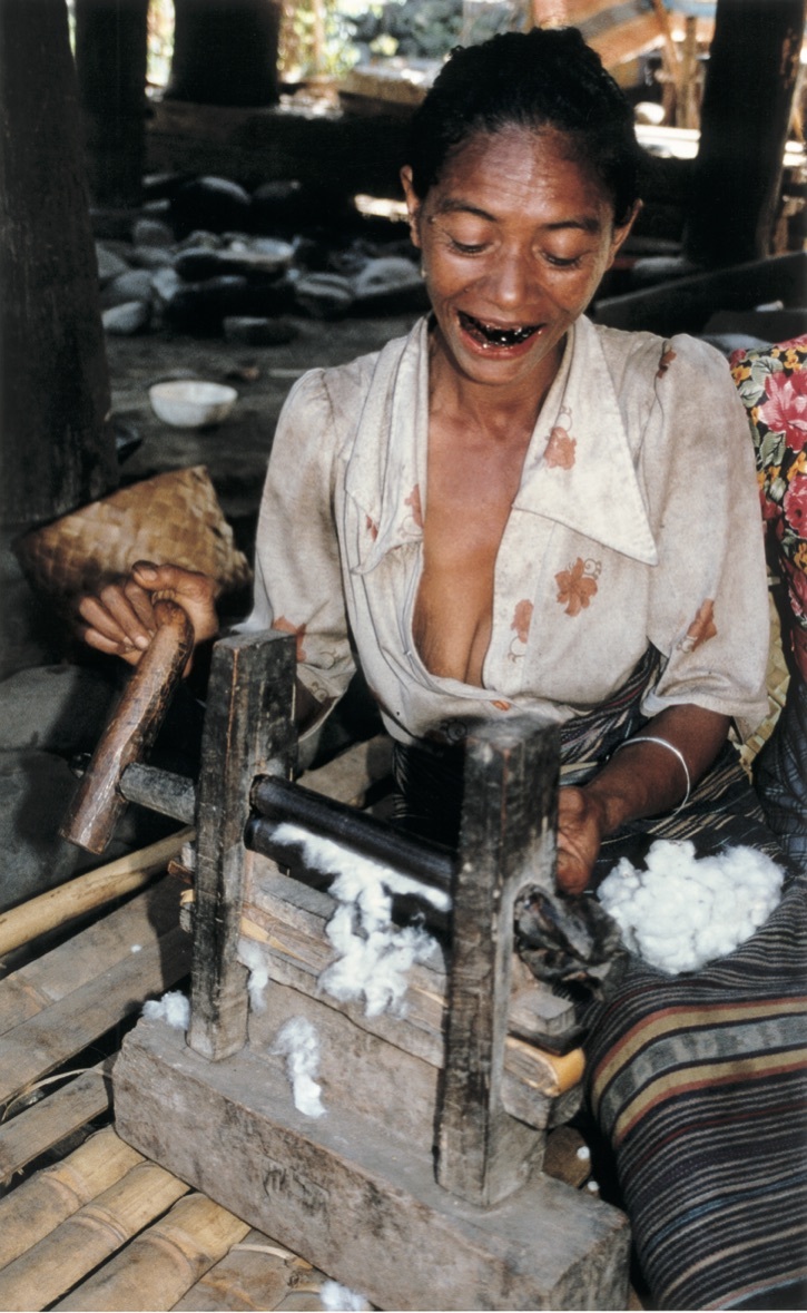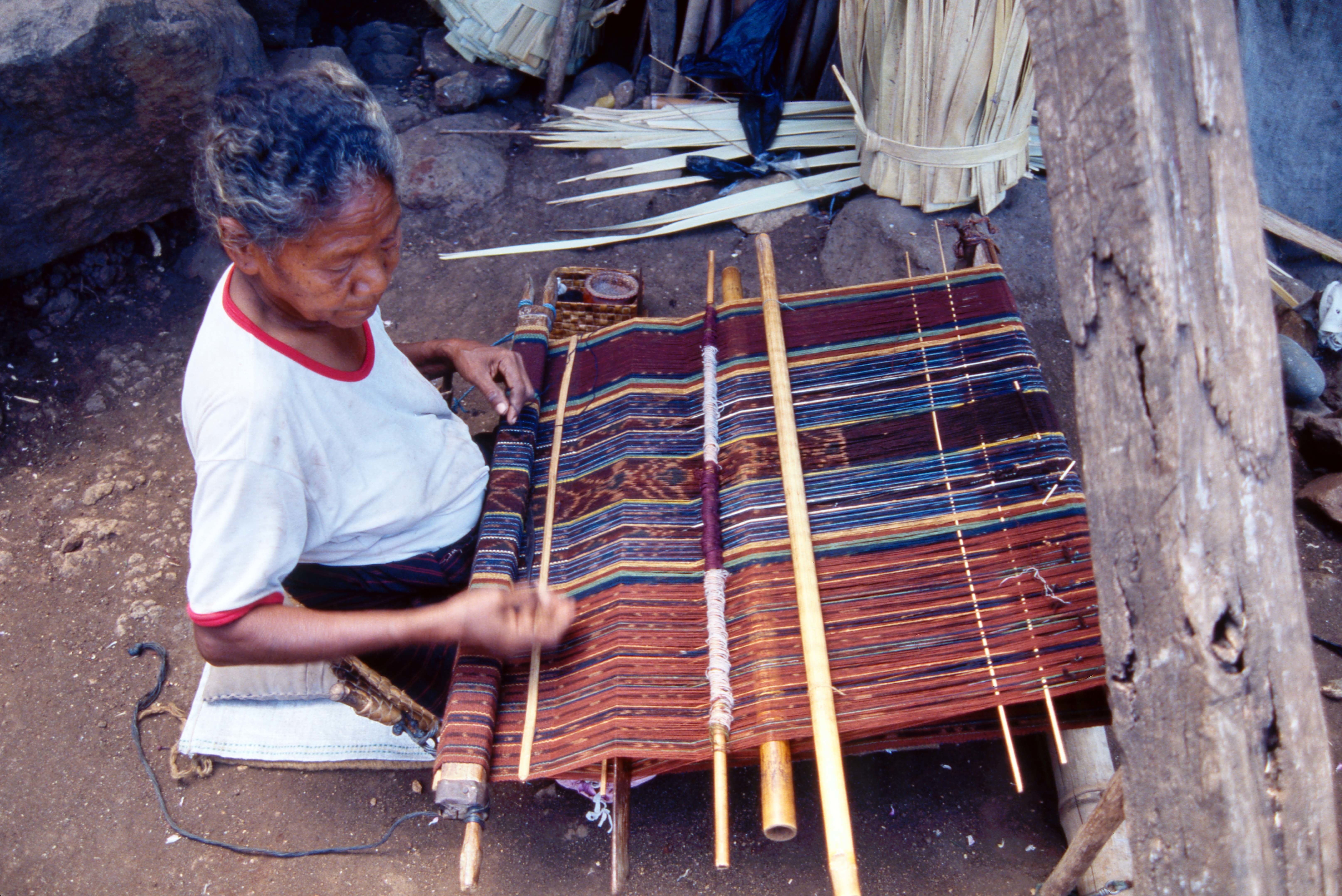 「山の民」は主に焼畑農業を営むレンバタ島の先住民です。もともとイカットの技術を持っていたと考えられます。綿、藍、茜などイカットに必要な素材は自ら産出しますが、藍染に不可欠な石灰は「海の民」との交易でまかなっています。「山の民」の中にはイカットづくりが禁止された地域があり、そこには「海の民」がつくったイカットが交易品として供給されています。イカットを身にまとって暮らすのは「海の民」と同様で、婚資用の特別なイカットを制作している地域もあります。