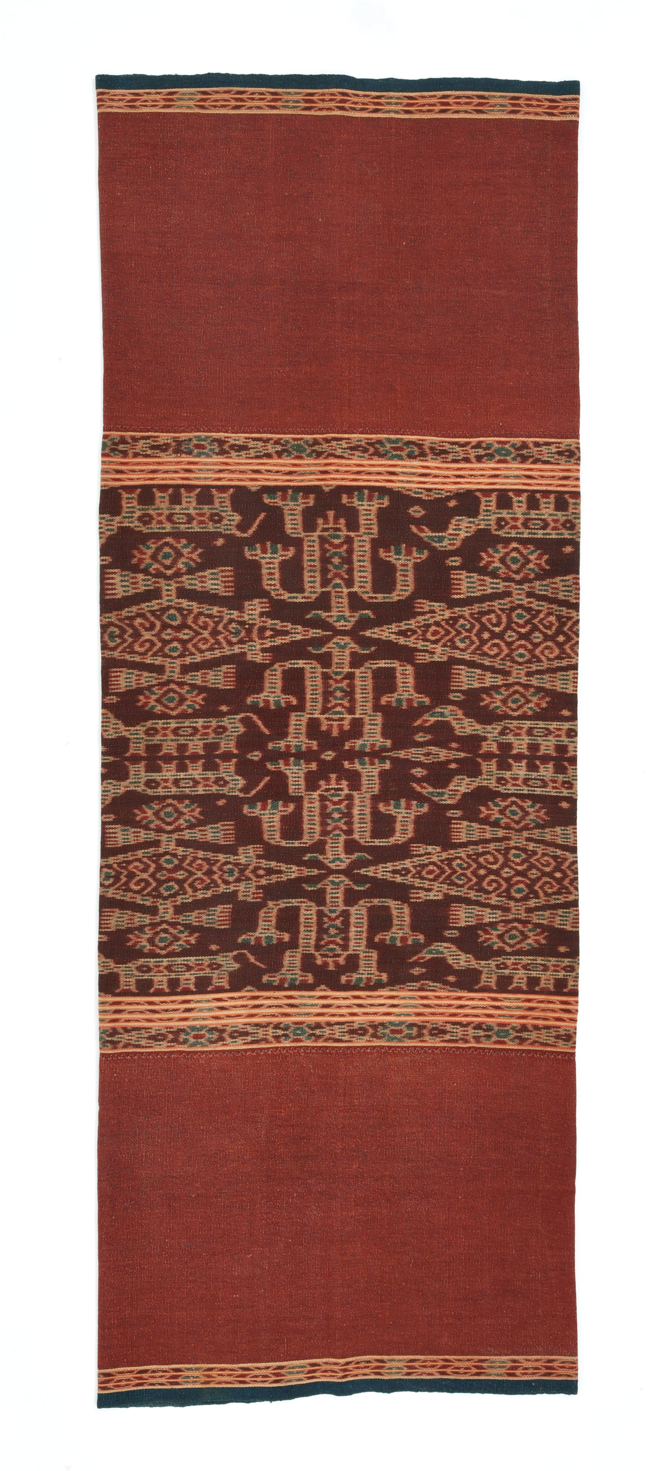 レンバタ島のイカットは、「海の民」と「山の民」とが物々交換によって制作に必要な材料を補い合うことで成り立っています。全工程が手作業でつくられるイカットは、日常着・祭礼着として暮らしの中に息づき、結納品(婚資)としても重要なものになっています。レンバタ島のイカットは、一見すると地味ですが、深い色合いの茜と藍で染められ、伝統的な意匠であるマンタのほか、人物の意匠などもみられます。