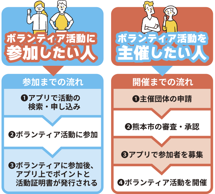 また、ボランティア参加者を募集する「主催者ミニアプリ」などの機能もあり、主催団体様にも役立つアプリです。(主催団体として事前申請が必要となります)