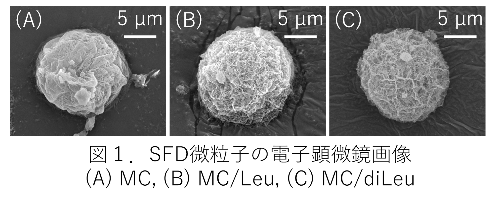 そこで本研究では、吸入剤応用に適した低密度の粉末微粒子を簡便に製造可能な噴霧急速凍結乾燥 (SFD)注2)を採用し、粘膜付着剤 (メチルセルロース (MC))と分散補助剤 (ロイシン (Leu)およびジロイシン (diLeu))を組み合わせたSFD微粒子を新たに作成し、吸入剤としての適用性ならびに薬物の肺内滞留効果を検証しました。