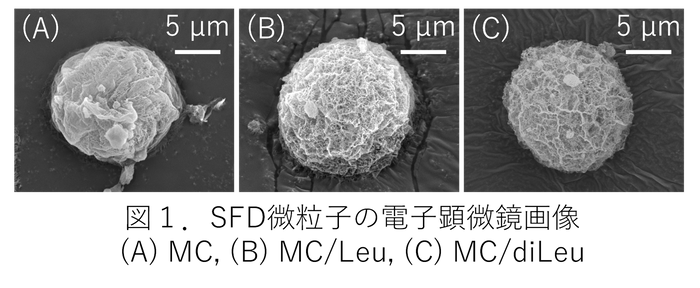 作成したSFD微粒子を電子顕微鏡で観察したところ、成分による大きな違いはみられず、すべてのSFD微粒子が10–20 µmの直径で中空多孔性に富む球状構造を有していました (図1)。