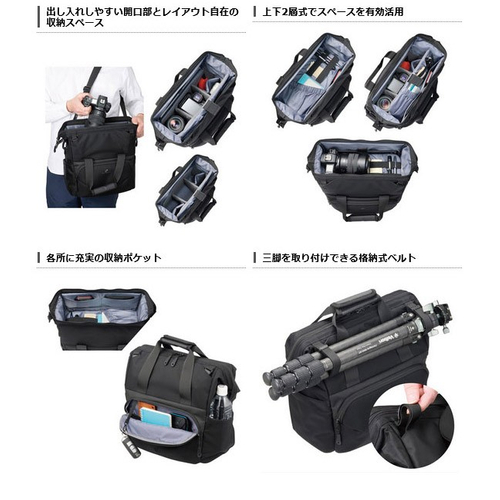 がま口タイプの大きく開くトップフレーム構造で機材の出し入れがしやすく、大容量の機材収納スペースは両サイドからもアクセス可能。スピーディーな撮影と快適な持ち運びを両立し、あらゆる撮影スタイルに対応する多機能でマルチユースなカメラバッグです。