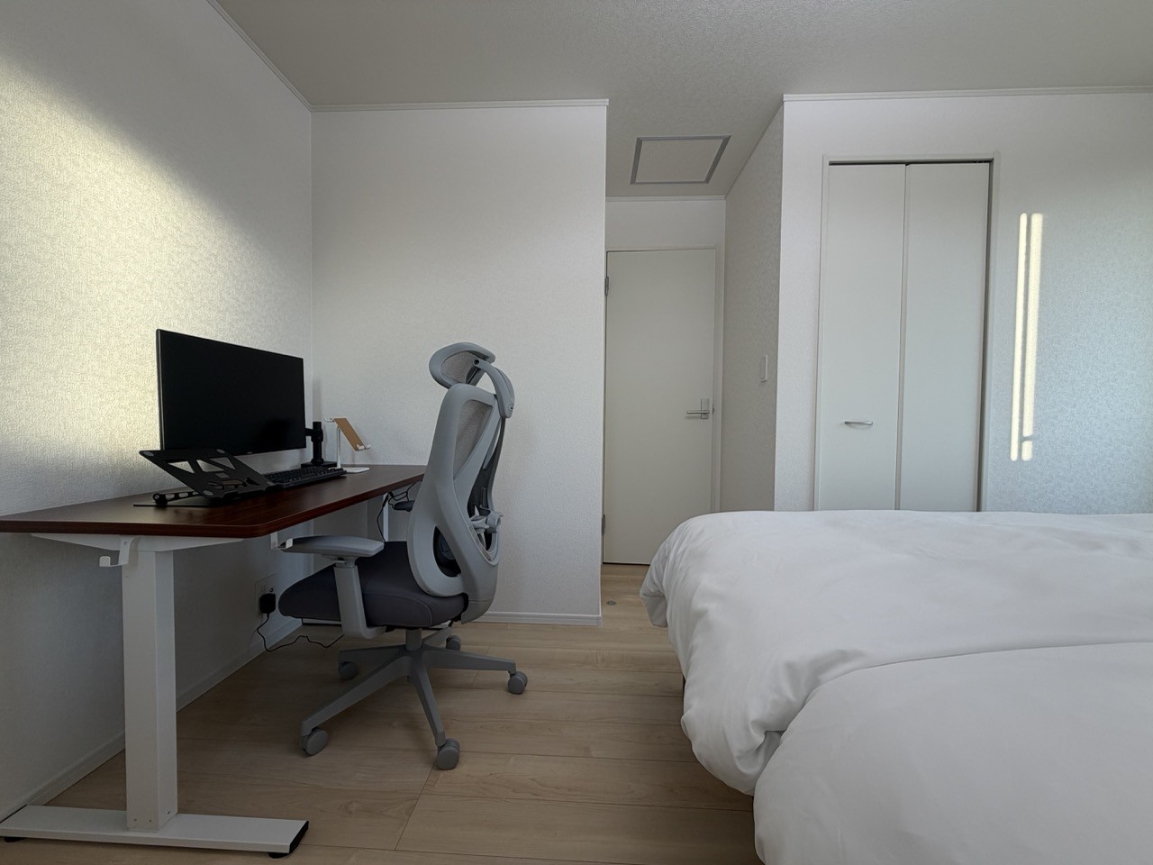 高速WiFi・プリンターに加え、2階の3つの寝室にそれぞれ「昇降デスク」、「モニターアーム」、「27型液晶モニター」、「キーボード」、「人間工学チェア」を完備することで仕事環境を整備。