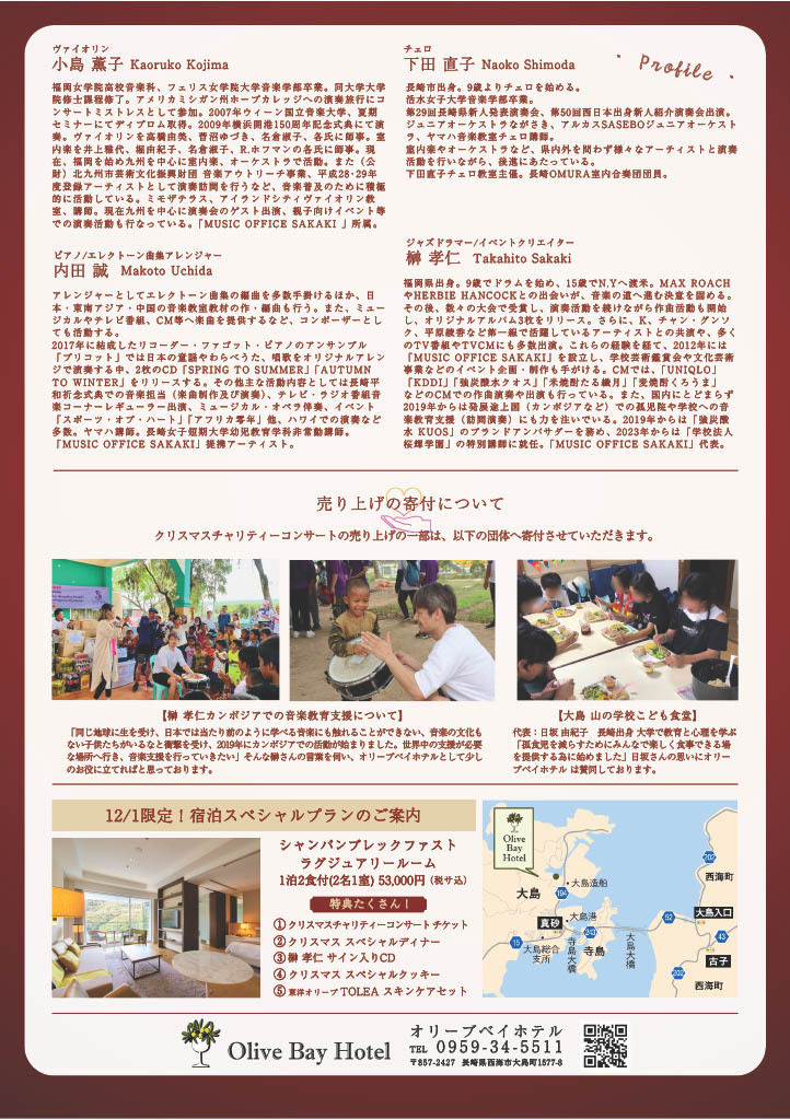 ホテル運営事業 株式会社 オリーブベイホテル(所在地:長崎県西海市大島町1577-8、代表取締役社長:下田 憲一)総支配人 ケネス・ミツツネ(ハワイ出身)は、2024年12月1日(日)クリスマスチャリティーコンサートを開催します。売り上げの一部は、ドラムパーカッション奏者で文化事業クリエイター 榊 孝仁さん(Music Office SAKAKI 代表)が活動されている「カンボジア音楽教育支援」と、大島町で運営しているこども食堂「大島 山の学校 こども食堂」(代表 日坂 由紀子さん)へ寄付させていただきます。