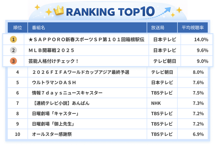 シリーズ別ランキングをカテゴリ別に見ると、スポーツは「箱根駅伝」や「MLB開幕戦2025」、ニュース・報道は「情報7daysニュースキャスター」や「ニュース7」、ドラマは「日曜劇場」や「連続テレビ小説」、バラエティは「芸能人格付けチェック!」「ウルトラマンDASH」「オールスター感謝祭」など、各ジャンルの定番番組が上位を占めました。