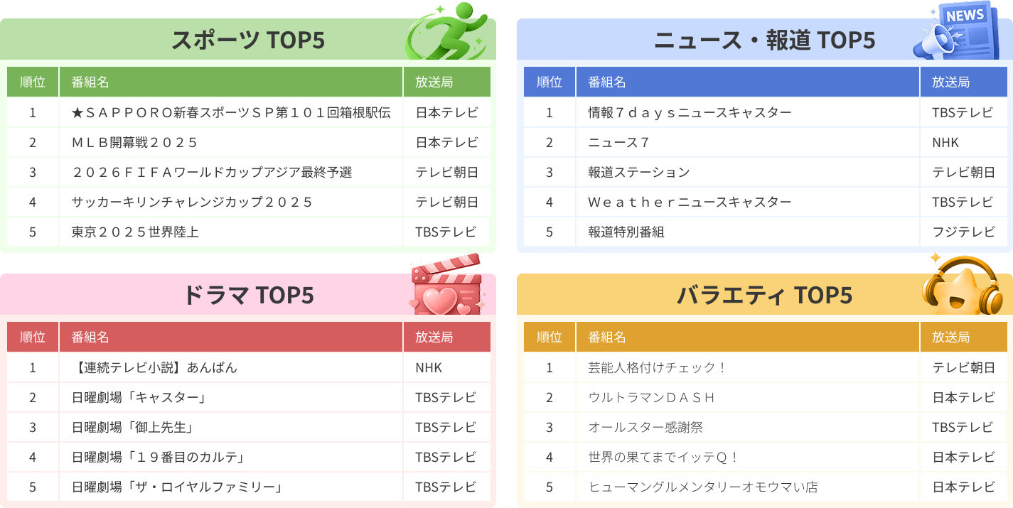 箱根駅伝やMLB開幕戦、FIFAワールドカップアジア最終予選、世界陸上などのライブスポーツに加え、夜のニュース・報道番組、正月特番や日曜劇場シリーズ、連続テレビ小説などの長期ドラマが上位に並び、「ライブスポーツ」「夜のニュース」「長期ドラマ・正月特番」が2025年のテレビ視聴を特徴づける結果となりました。