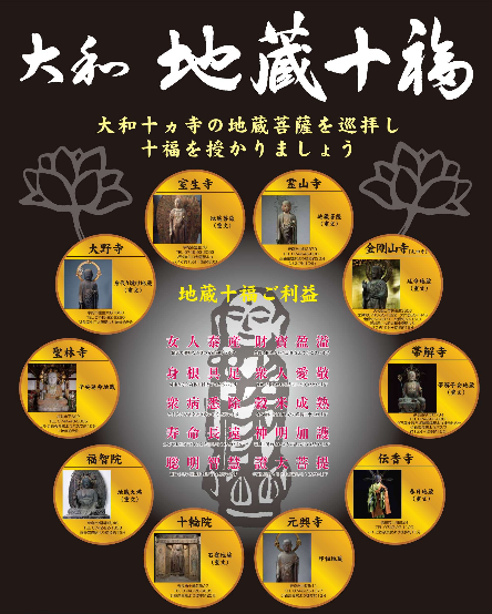 奈良県内の魅力ある地蔵菩薩を安置する十カ寺の地蔵尊を巡拝することで福徳が授かる「大和地蔵十福」。地蔵十福とは、地蔵本願経や延命地蔵経で説かれており、十カ寺の地蔵尊を巡拝・満願すれば、「女人泰産(健康で聡明な子どもの安産が叶います)」、「身根具足(健全な心と身体を授けてくださいます)」など、十の福が授かります。