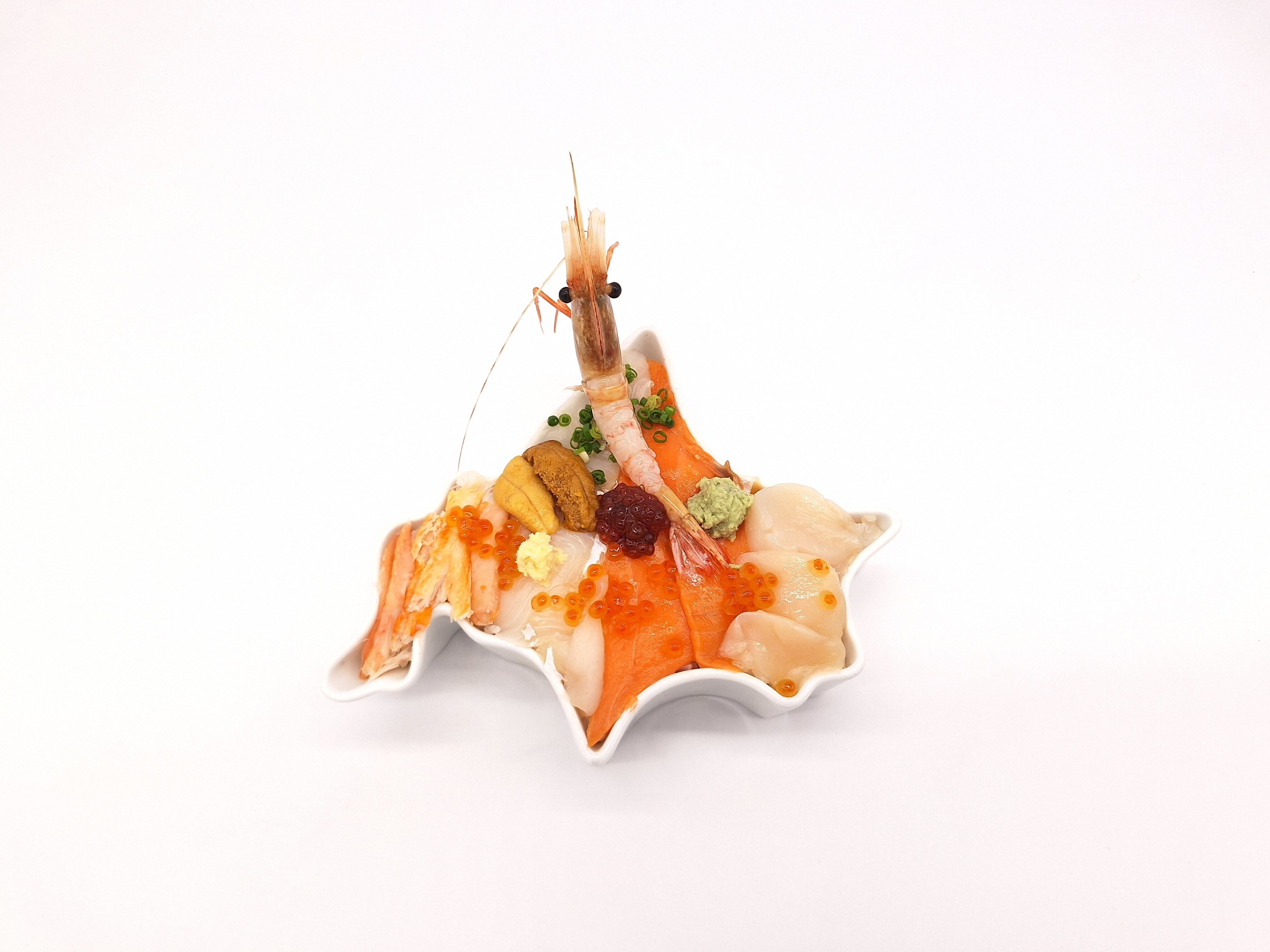 北海道産の食材を主につかった海鮮丼。北海道の形をした器に盛り付け、見た目も味も北海道をして堪能していただける一品です。