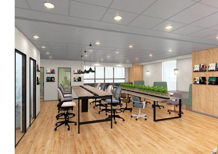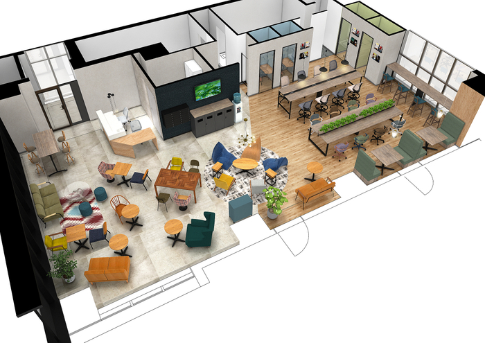 コワーキングスペースには交流やイベントができるスペースがあり、イノベーションを生み出す仲間との出会いを提供します。奥にはゆったりと腰を据えて作業ができるデスクワークスペースもあります。