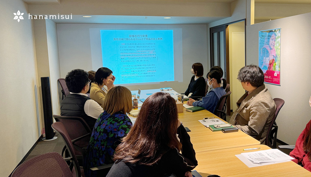 ハナミスイは2003年より、女性のインティメイトエリアに使用する商品の研究開発をし、今年で21年目を迎えます。昨今は規模も大きく東京ビッグサイトでの展示会にも出展をしております。2020年は日本でのフェムテック元年と呼ばれ、女性の健康課題への注目が集まっております。それに伴い、ジェンダーや性的指向などセクシュアリティにまつわるアンコンシャスバイアスがハラスメントとなりうるケースも見受けられるようになりました。そこで、ハナミスイはお客様への接客、社内でのコミュニケーションに問題がないか今一度社員を集め、研修を実施することになりました。