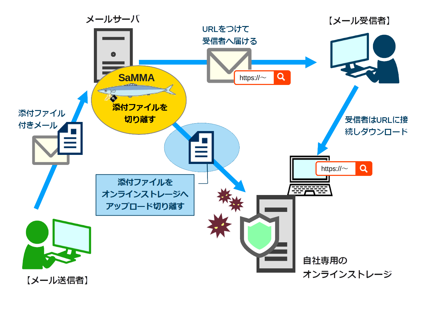 『SaMMA』の『オンラインストレージモード』とは、メールでファイルを送信する際に、添付ファイルを自動でメールから切り離しオンラインストレージにアップロードを行うモードです。受信者のメールには、添付ファイルの代わりにオンラインストレージのURLが添付されます。