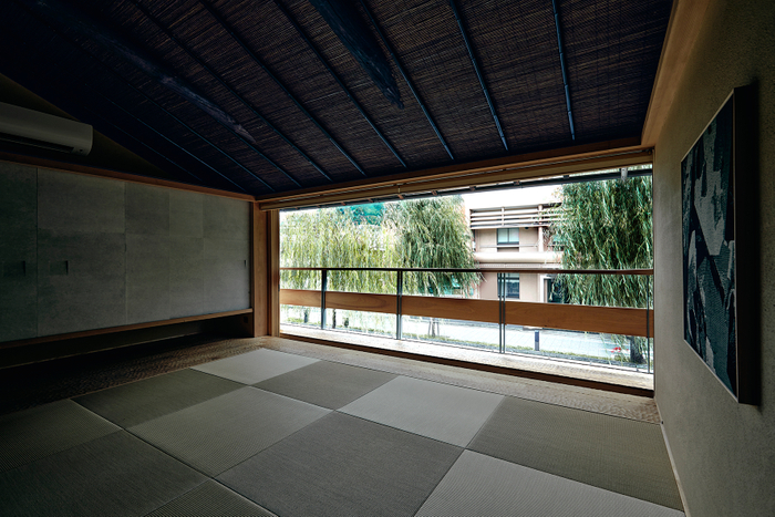 白川に面した2Fの座敷は、さながら「床(ゆか)」のようになっており、白川に面して全面オープンすることができます。開放的な空間で川の流れる音を聞きながら、ゆっくりとおくつろぎいただけます。対照的に、2Fの和室は障子の光のみの空間になっているため、静かに読書などをお楽しみいただけます。