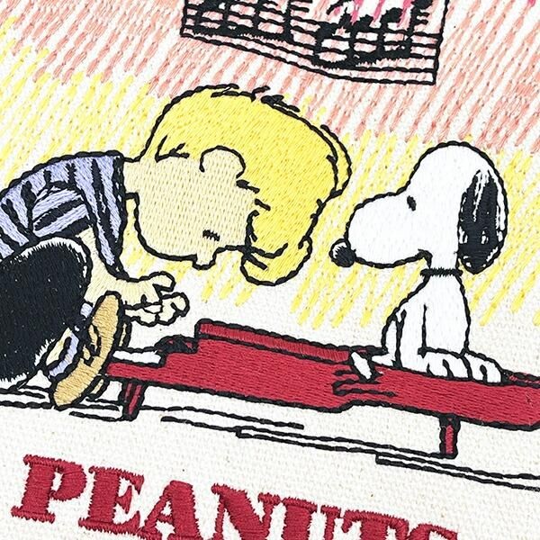 ポーチの正面にはカラフルなスヌーピーの畳刺繍デザインが広がっています。よく見ると縫い目が一つ一つ細かく、柄も結構細いのでこだわりと高級感を感じられます。