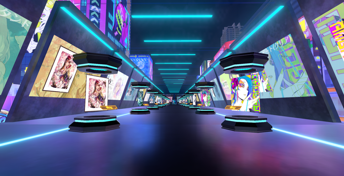 バーチャル秋葉原内ではアニメやマンガのIPの取り扱いのほか、クリエイターによるIPの二次創作を可能とするビジネススキームを構築し、空間内で展示販売。コンテンツはNFT(非代替性トークン)で管理され、健全な創作ビジネスの循環を実現させる仕組みがあります。