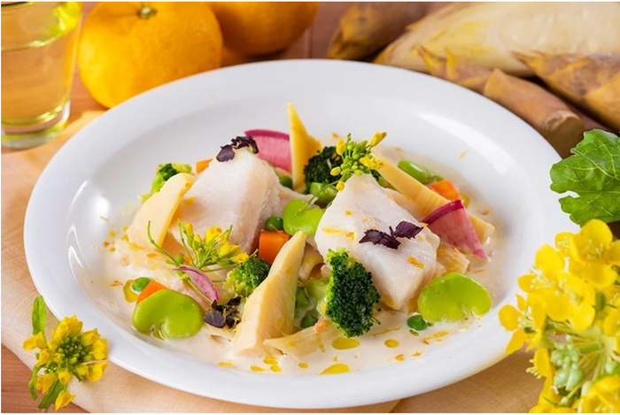春らしい色合いが目にもご馳走の「白身魚とたけのこのポッシェ~瀬戸内産ゆずのソース~」。