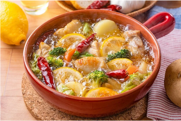 「親鶏のアヒージョ ~瀬戸内レモンの香り~」。噛みごたえがあり濃い味わいが楽しめる親鶏を使ったアヒージョ。具材の旨味が溶け出したオリーブオイルのソースに瀬戸内産レモンが爽やかなアクセントを添えます。
