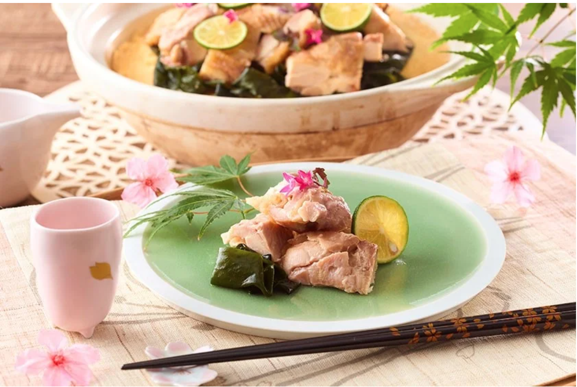 鳴門わかめと鶏もも肉を蒸し焼きにした一品。わかめの塩味で鶏もも肉本来の美味しさを、シンプルにお楽しみください。