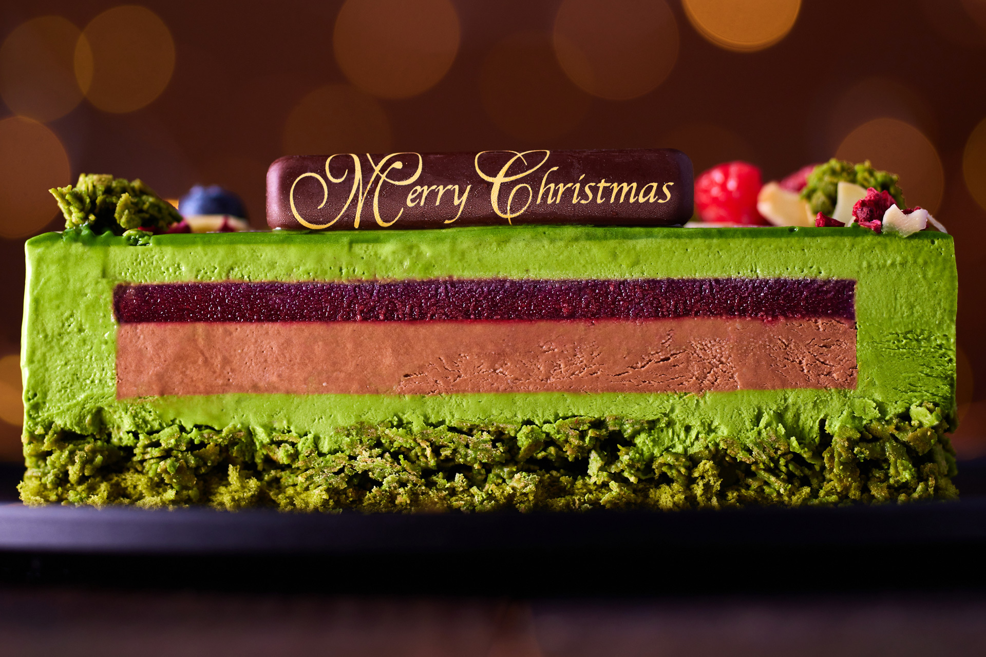 目をひくのは見た目だけでなく、その断面も。宇治抹茶チョコレートムースに包まれたケーキにナイフを入れると、カシスとラズベリーの甘酸っぱいジュレに、ベルギー産ダークチョコレートを使用したムース、緑に囲われたシックな2層がお出迎え。土台のしっとりとした宇治抹茶スポンジの上には、ザクザクとした食感の宇治抹茶フィアンティーヌを忍ばせております。2種のチョコレートを存分に味わう、クリスマス限定の宇治抹茶チョコレートケーキです。