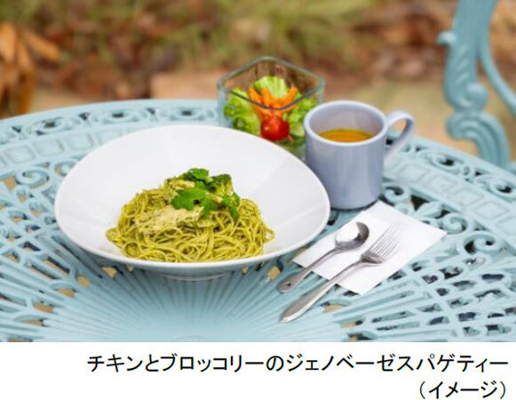 バジルペーストにオリーブオイル、パルメザンチーズ、唐辛子で仕上げたジェノベーゼソースを使った風味豊かなスパゲティーです。国産鶏むね肉を使用した蒸し鶏ともよく合います。