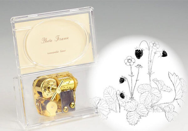 当フェア期間中の限定オリジナルデザインです。六甲山でも春に見られるワイルドストロベリーをイメージし、デザインしました。演奏中のオルゴールの動きも楽しめます。フォトフレームのクリア面にレーザー彫刻を施しています。