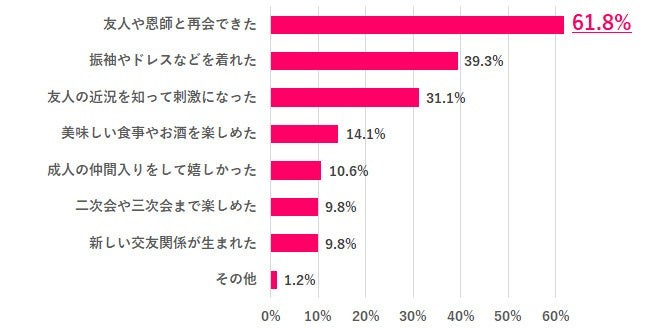 Q2で楽しかったと回答した人にその理由を聞いたところ、1位「友人や恩師と再会できた」61.8%、2位「振袖やドレスなどを着れた」39.3%、3位「友人の近況を知って刺激になった」31.1%でした。