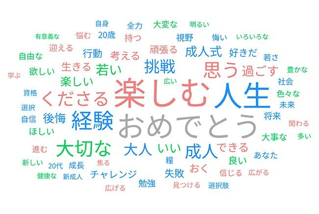 20歳を迎えた人へのひとことを聞いたところ、「楽しむ」「おめでとう」「人生」が頻出していました。他にも「頑張る」「チャレンジ」「成長」「自由」「明るい」など、ポジティブかつ温かい言葉が多くあげられました。