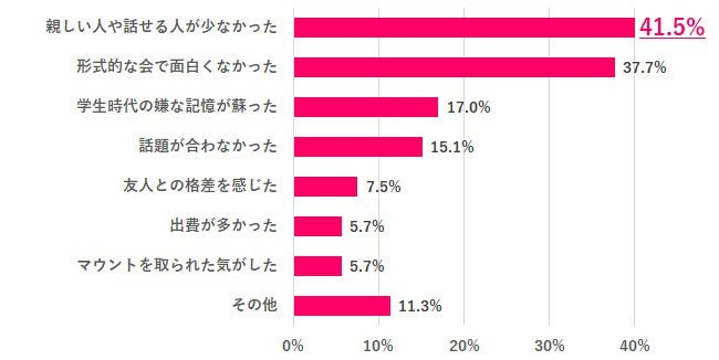 参加したものの楽しくなかったと回答した人にその理由を聞いたところ、「親しい人や話せる人が少なかった」が41.5%で最も多く、次いで「形式的な会で面白くなかった」37.7%が多い回答でした。