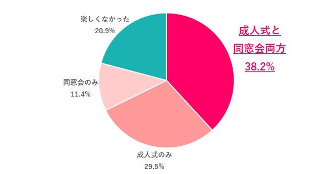 参加して楽しかったものを聞いたところ、「成人式と同窓会両方」が38.2%で最も多く、次いで「成人式のみ」29.5%、「同窓会のみ」11.4%でした。8割近くの人がいずれかの場を楽しめた一方で、「楽しくなかった」と回答した人は20.9%でした。