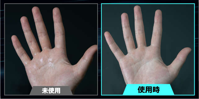 保湿成分を配合し一定の保湿力を持たせることで、サラサラしすぎず、素手のような理想のグリップ力を実現。最もパフォーマンスを発揮しやすい状態になるよう、細かく成分を調整し、ゲーマーのコンマの動きもサポートします。