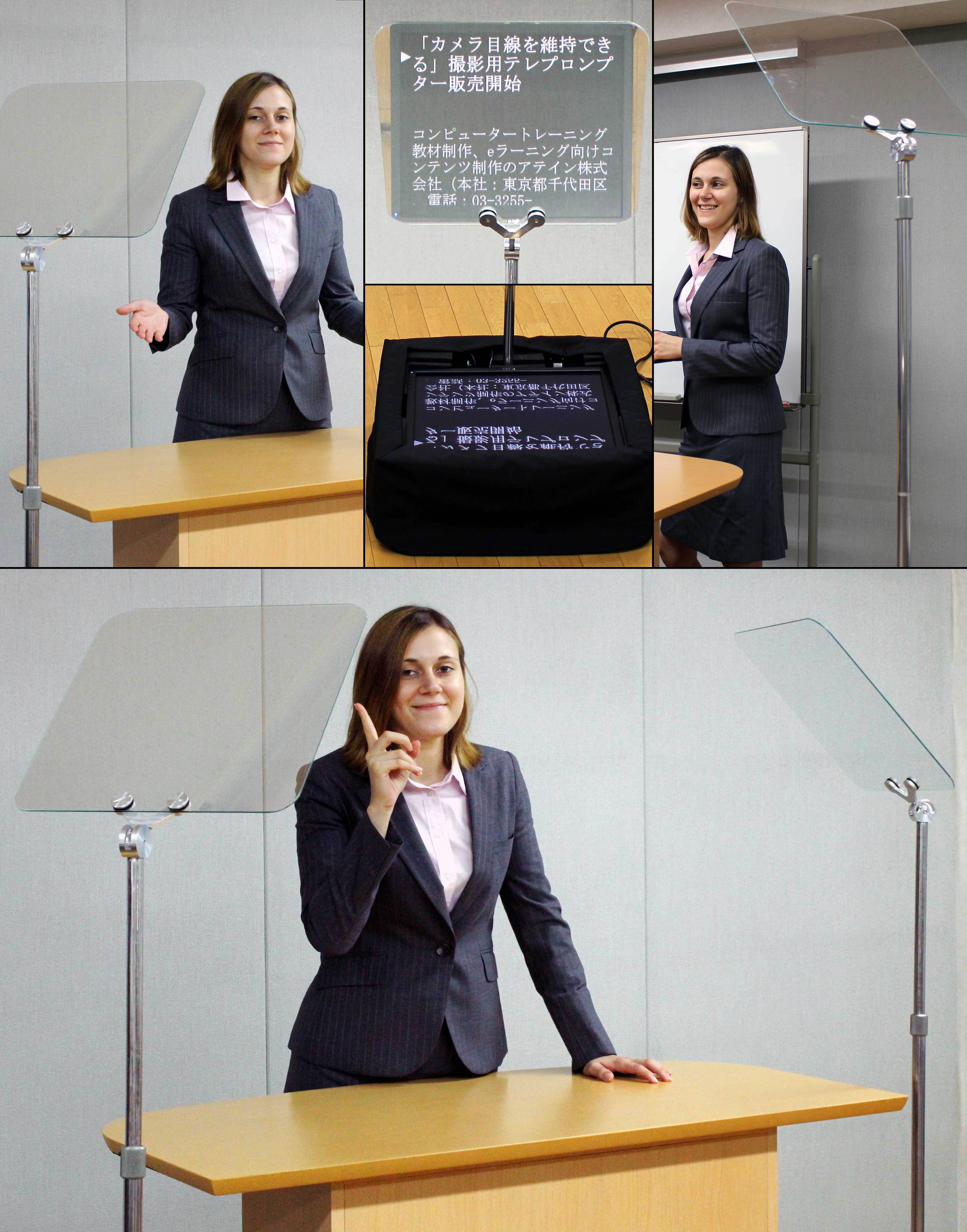 スピーチプロンプターは、原稿テキストを投影する演説用機材です。ハーフミラーにテキストを投影させることで、演説者は聴衆に目を向けながら、原稿を読むことができます。モニターは床に置き、付属のソフトウェアを使って、画面に原稿を表示、スクロールすることができます。観客からは、投影された原稿は見えません。