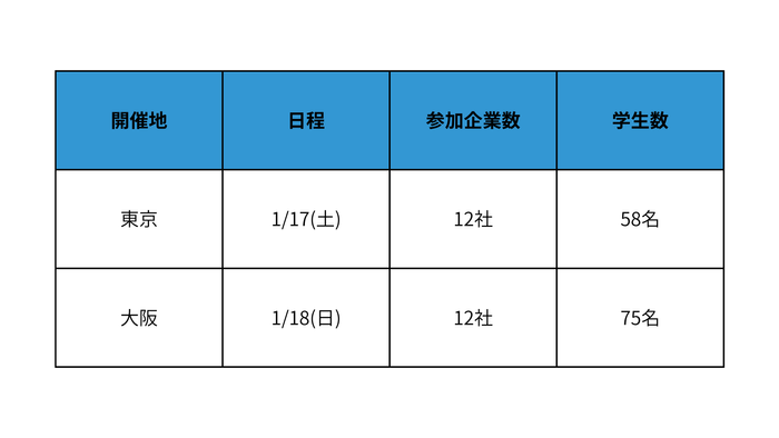 今回は、 **東京で58名・大阪で75名** の学生が参加し、活気溢れる雰囲気の中、企業と学生の「出会い」を提供しました。